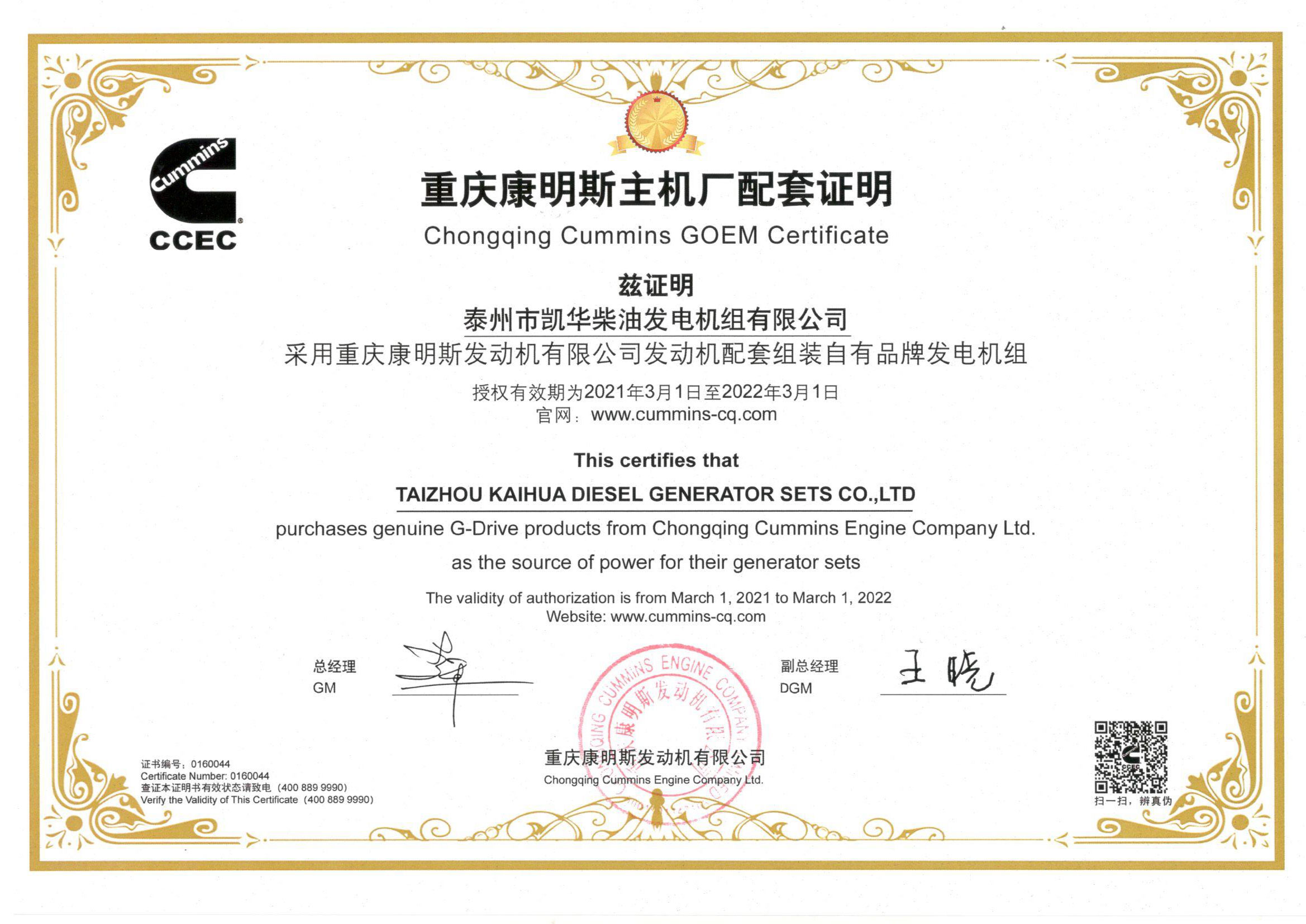 泰州市凱華柴油發(fā)電機(jī)組有限公司創(chuàng)建于2003年,是一家集柴油發(fā)電機(jī)組燃?xì)獍l(fā)電機(jī)組的研發(fā)、生產(chǎn)、銷售為一體的高新技術(shù)民營(yíng)企業(yè),公司座落于“漢唐古郡,淮海名區(qū)”,具有“鳳凰城”美稱的祥泰之州——江蘇省泰州市,地處中國(guó)經(jīng)濟(jì)最發(fā)達(dá)的長(zhǎng)三角經(jīng)濟(jì)圈,水陸空立體交通,地理位置十分優(yōu)越。公司目前注冊(cè)資本金11800萬(wàn)元人民幣,生產(chǎn)基地占地六十畝,現(xiàn)有各類高素質(zhì)員工一百多名,專業(yè)技術(shù)人員達(dá)46人,其中高級(jí)技術(shù)人員16人,年銷售額近6億元。 公司主營(yíng)產(chǎn)品:3~3000KW陸用柴油發(fā)電機(jī)組,15~600KW移動(dòng)拖車電站,12~1000KW船用應(yīng)急柴油發(fā)電機(jī)組,各種靜音型、中高壓、多機(jī)并聯(lián)、燃?xì)獾忍胤N機(jī)組以及進(jìn)口系列柴油發(fā)電機(jī)組,可滿足不同客戶的一切電力需求,還可滿足用戶不同電壓、不同頻率的要求。凱華公司是康明斯品牌的授權(quán)代理商,專業(yè)生產(chǎn)供應(yīng)康明斯柴油發(fā)電機(jī)組。